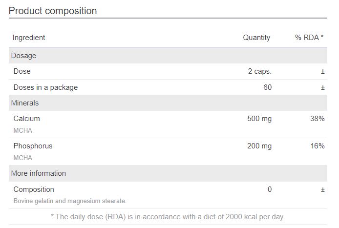 Съставки: калций, фосфор, телешки желатин (капсула) и магнезиев стеарат (растителен източник)