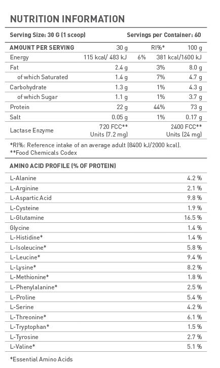 Съставки: Хидролизиран суроватъчен протеин (от мляко, емулсатор: соев лецитин), хидролизиран суроватъчен протеинов изолат (от мляко, емулгатор: соев лецитин), какао на прах с намалени мазнини (10-12%), аромати (шоколад, шоколадово пралине (XANTHAN) дъвка), подсладители (ацесулфам К, сукралоза), микрогранулирана β-галактозидаза (Tolerase™ L лактазен ензим).