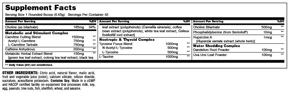 Съставки: Холин (като битартрат), Карнити (ацетил L-карнитин и L-карнитин тартрат), Кофеин, Смес от билкови екстракти (екстракт от листа на зелен чай, екстракт от листа на чай Оолонг, екстракт от листа на черен чай (полифеноли) (Camellia sinensis), екстракт от зърна на кафе (полифеноли), екстракт от листа на бял чай, екстракт от корен на Coleus forskohlii, Ноотропен и тиреоиден комплекс (Тирозин 1, в т.ч. N-ацетил-L-тирозин, L-тирозин, L-таурин, Холин битартрат, Фосфатидилсерин, Хуперзин А (екстракт от трева Huperzia serrata)), Водоотделящ комплекс (Корен от глухарче на прах, Листа от ува урси на прах)
