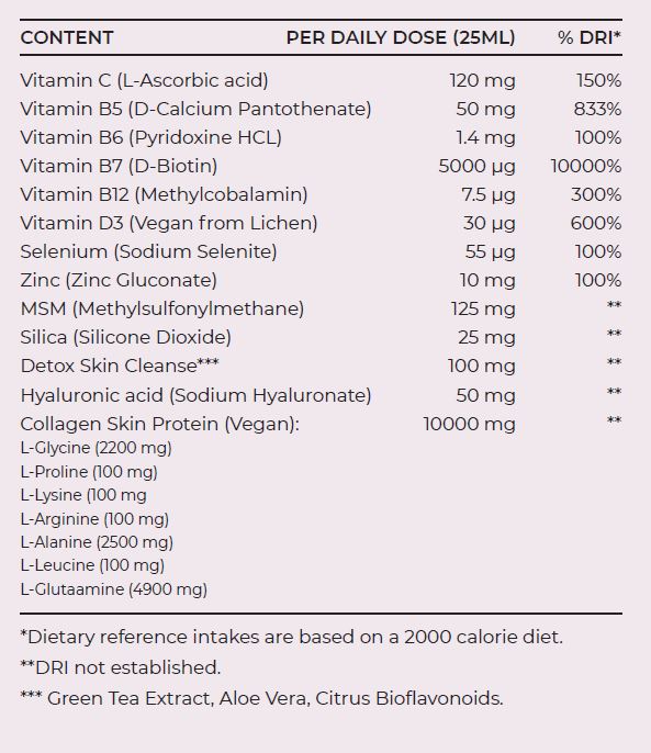 Съставки: филтрирана вода, колагенов протеин за кожата (веган): глицин, пролин, лизин, аргинин, аланин, левцин, глутамин, натурална смес от плодови сокове от концентрат; портокал, ябълка, мандарина, гуава, папая, лайм, манго, ананас, грозде, органични плодове и захар от захарна тръстика, витамин С, хиалуронова киселина, витамин В5, естествени аромати, естествен оцветител, екстракт от зелен чай, алое вера, цитрусови биофлавоноиди, витамин В7, витамин B6, лимонена киселина, витамин D3, селен, витамин B12, 100% натурален аромат и натурален цвят