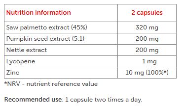 Съставки: Saw Palmetto (екстракт), тиквено семе (екстракт), коприва (екстракт), ликопен, цинк