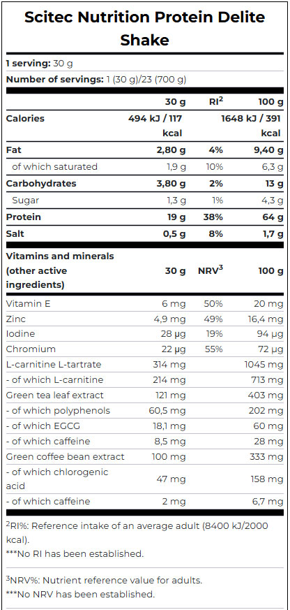 SCITEC Protein Delite Shake не само съдържа 19 g протеин на порция, но към него са добавени хром, цинк, йод и дори екстракти от зелено кафе и зелен чай, Л-карнитин и витамин Е.