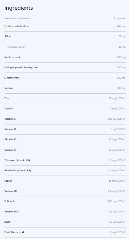 Съставки: екстракт от полски хвощ (Equisetum arvense L.), витамини [L-аскорбинова киселина – витамин С, DL-алфа-токоферил ацетат – витамин Е, никотинамид – ниацин, ретинил ацетат – витамин А, калциев D-пантотенат – пантотенова киселина, цианокобаламин – витамин B12, холекалциферол – витамин D, пиридоксин хидрохлорид – витамин B6, рибофлавин – витамин B2, тиамин мононитрат – тиамин (витамин B1), птероилмоноглутаминова киселина – фолиева киселина, D-биотин – биотин], L-метионин (Un екстракт от листа от коприва dioica L.), цинков глюконат, цистин, колагенов протеинов хидролизат, силициев диоксид, меден (II) глюконат, пълнител – целулоза; средство против слепване – магнезиеви соли на мастни киселини; капсула (желатин, багрило – Е 171)
