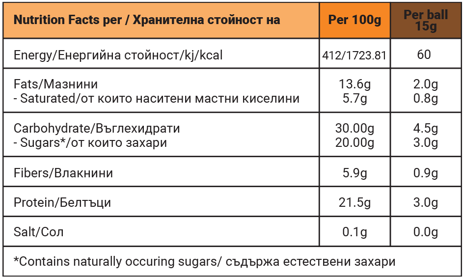 Съставки: фурми, портокалови кори, кашу, какао, грахов и бобен протеин с аромат на какао и портокал, безглутенови овесени ядки, лешников тахан, рожков, кокосово масло
