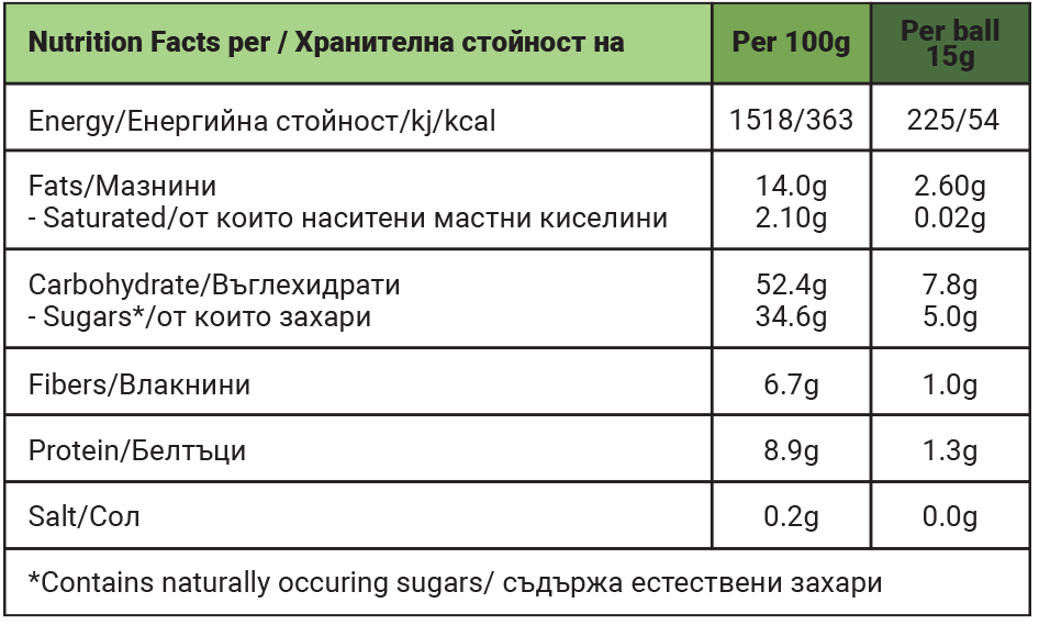 Съставки: фурми, безглутенови овесени ядки, слънчогледов тахан, кашу, шам-фъстък, лимоново масло