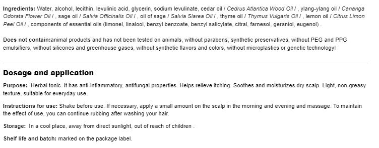 Тоникът за коса концентрирани масла от екстракти на Иланг-Иланг, Кедрово дърво, Градински чай, Кананга, Салвия, Мащерка, Лимонова кора и лайм е подходящ за дълбоко хидратиране на скалпа и косъма за да бъдат предпазени вредите причинени от сухота, както и от чувствителен скалп. Подходящ е за използване, както за регенериране и възстановяване на косата, така и като превантивна мярка от задълбочаване на проблемите при вече съхнещ косъм о скалп.