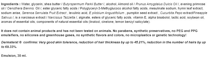 Според тестове в немския институт Dermatest, продуктът се понася добре от кожата, не предизвиква никакви странични реакции и намалява дебелината на косъма с до 45%, а броя им – с до 69%.