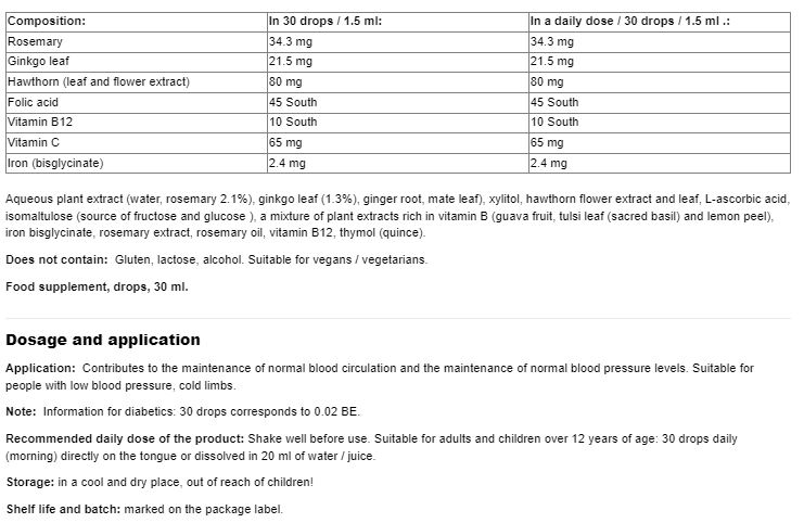 Билкови капки за поддържане на нормално кръвно налягане с глог. Капките за кръвообращение с глог поддържат нормалното кръвно налягане, особено хората със симптоми на замайване и чернота пред очите могат да се възползват от тях. Засегнатите често страдат и от сутрешна умора, обща липса на енергия, вътрешно безпокойство, бледост, треперене и студени ръце и крака. Водният растителен екстракт е обогатен и с витамин С, витамин В12, желязо и фолиева киселина, които допринасят за нормалното кръвообразуване и противодействат на умората и отпадналостта.