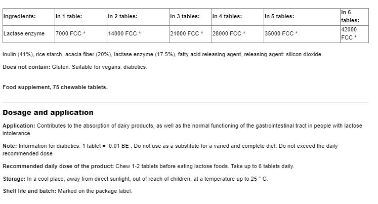 Начин на приемане: Приемайте 1 доза 30 минути преди консумацията на млечни продукти