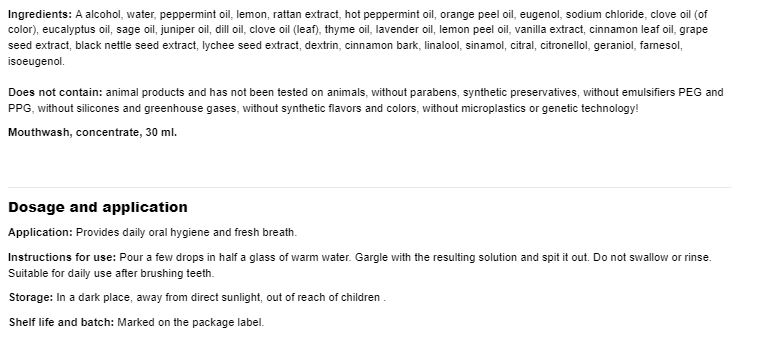 Начин на употреба: Разтворете няколко капки от концентрата в 150 мл вода, разнесете чрез гаргара в устната си кухина за около 2 минути и изплюйте. Използвайте 2 пъти дневно.