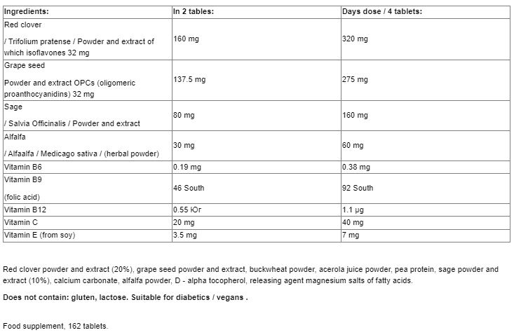 Съдържащият се хмел има фитоестрогенни свойства и се понася много добре. Заедно с витамин В6 и витамин Е той може да допринесе за регулирането на хормоналната активност и хормоналния метаболизъм. Веганската и безглутенова хранителна добавка съдържа също градински чай и люцерна, които в комбинация могат да подпомогнат особено при горещи вълни и нощни пристъпи на изпотяване.