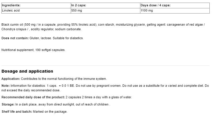 Свойствата на маслото от черен кимион се дължат на неговия уникален профил от фитонутриенти. В допълнение към основното активно и антиоксидантно съединение тимохинон, то съдържа значително количество полиненаситени мастни киселини, предимно линолова киселина, до която е стандартизирано нашето масло от черни семена. Линоловата киселина е основна омега-6 мастна киселина, която организмът не може да произвежда сам. Тя играе основна роля в няколко функции, като например подпомага клетъчните мембрани.