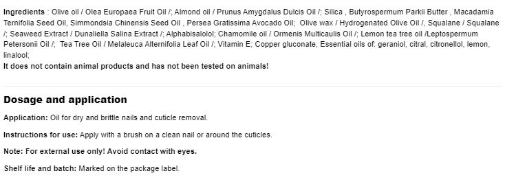 Начин на употреба: Нанасяйте малко количество върху ноктите и кожичките два пъти дневно с помощта на четката и масажирайте нежно. Само за външна употреба.