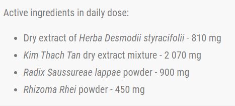 Съдържание: Сух екстракт от Herba Desmodii styracifolii, Kim Thach Tan смес сух екстракт, Radix Saussureae lappae на прах, Rhizoma Rhei на прах.