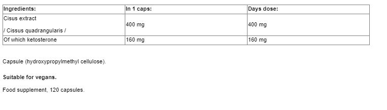 VEGAVERO Cissus Quadrangularis капсули вече съдържат 400 mg екстракт от Cissus quadrangulatis с 40% кетостерони. Поради високата доза препоръчителният дневен прием е само една капсула. Продуктът не съдържа никакви добавки като микрокристална целулоза или магнезиев стеарат.