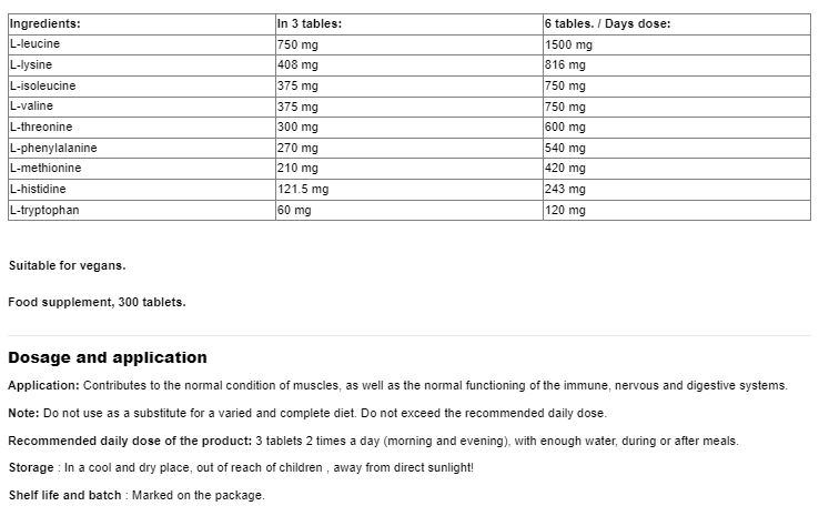 Съставки: Аминокиселинен комплекс; L-Leucine, L-lysine, L-Isoleucine, L-Valine, L-Phenylanine, L-Threonine, L-Histedine, L-Methionine, L-Tryptophane