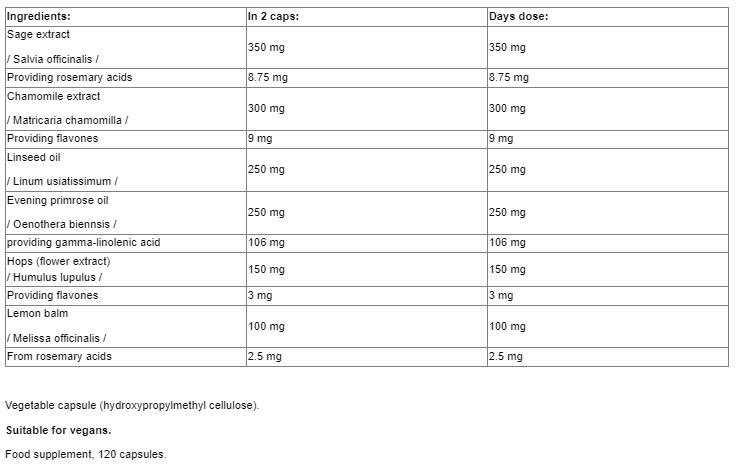 100% естествени съставки на растителна основа. Добавени са екстракти от градински чай, маточина и лайка, както и от вечерна иглика, хмел и ленено семе.