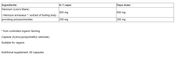 7500 mg изсушена органична херициум. Предимството на екстракта се състои не само в по-голямото количество херициум на капсула, но и в по-високата концентрация на биоактивни вещества, включително специфични за гъбата полизахариди като бета глюкан.