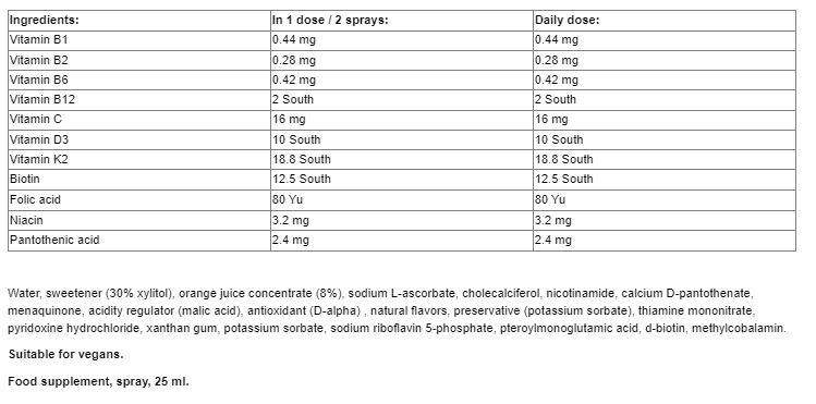 VEGAVERO Multivitamins for Children еиновативен мултивитаминен спрей за деца предлага внимателно балансирана формула от 11 основни витамина, включително витамин С, всичките 8 витамина от група В, както и витамините D3 и K2.