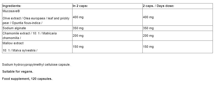 Reflu-X също така е без никакви примеси като и е подходящ за вегани. Всяка капсула съдържа 200 mg Mucosave®, 175 mg натриев алгинат, 100 mg лайка и 75 mg екстракт от слез.