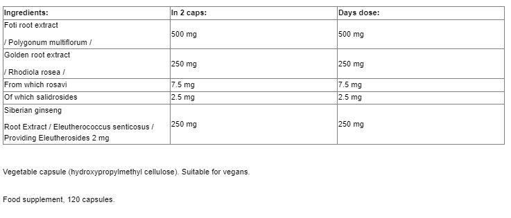 VEGAVERO са комбинирали родиола розеа с фо-ти, преоткрит корен, и сибирски женшен. Всички те се считат за адаптогени, традиционно използвани в китайските (ТКМ) и аюрведичните практики. Родиолата, "царят" на адаптогените, е известна с високото си съдържание на антиоксиданти, включително флавоноиди, тритерпени и танини. Тези фитонутриенти са дали на родиолата репутацията ѝ на полезна за повишаване на устойчивостта срещу психически и физически стрес.