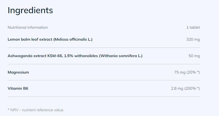 Съставки: магнезиев малат, екстракт от маточина (Melissa officinalis l.); микрокристална целулоза (напълнител); екстракт от ашваганда (Withania somnifera L.); поливинил алкохол, полиетилен гликол, талк (глазиращи агенти); омрежена натриева карбоксиметил целулоза (напълнител); магнезиев стеарат, силициев диоксид (средства против слепване); пиридоксин хидрохлорид (витамин В6); титанов диоксид, брилянтно синьо FCF, железен оксид (оцветители).