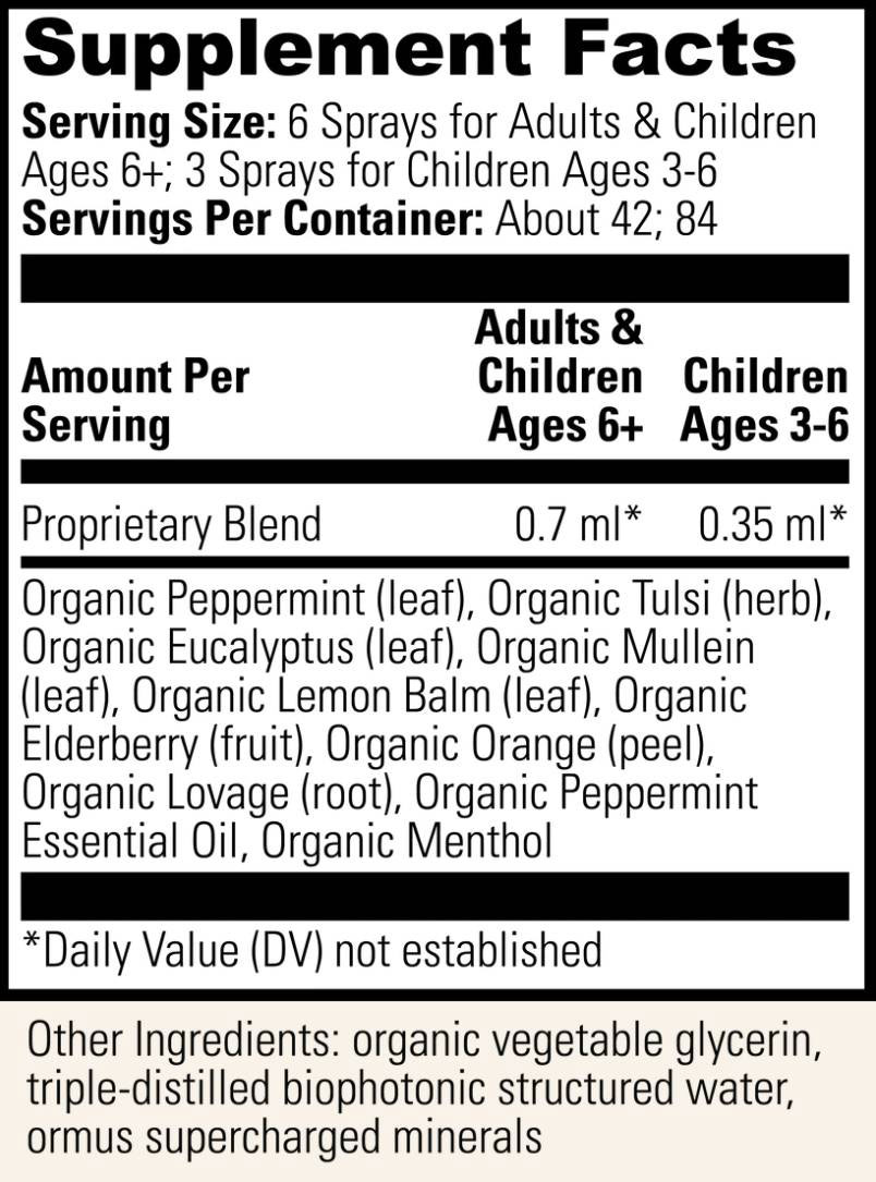 Съставки: Органичен Lovage (корен), Органичен евкалипт (листа), Органична мента (листа), Био Тулси (билка), Био маточина (листа), Органичен бъз (плод), Органичен портокал (кора), Органичен лопен, Органично етерично масло от мента, ментол