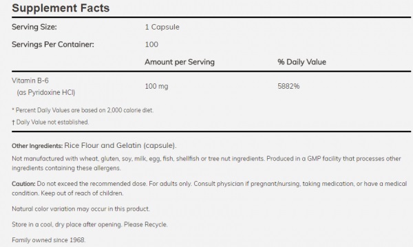 Съставки: Витамин В-6 (като пиридоксин HCl), оризово брашно и хипромелоза (целулозна капсула)