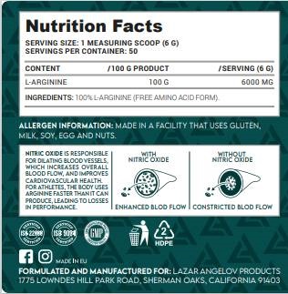 L-Arginine Powder от Lazar Angelov Nutrition е хранителна добавка с високо съдържание на Л-аргинин, чиято функция е да ускори регенерацията на мускулите, да подпомогне мускулния растеж, да подобри кръвообращението и да увеличи силата и издръжливостта. Консумацията му подпомага повишаването на хормона на растежа, забързва метаболизма и поддържа имунната система.