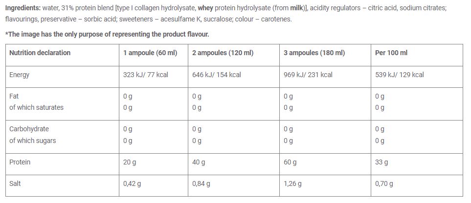 Съставки: вода, 31% протеинова смес [хидролизат на колаген тип I, хидролизат на суроватъчен протеин (от мляко)], регулатори на киселинността – лимонена киселина, натриеви цитрати; овкусители, консервант – сорбинова киселина; подсладители – ацесулфам К, сукралоза; цвят – каротини.
