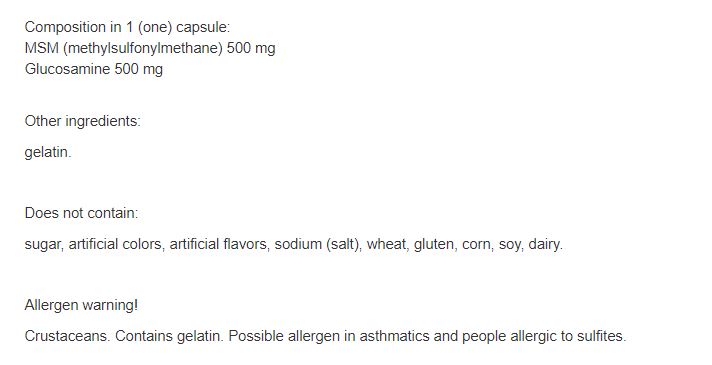 Съставки: MSM( метилсулфонилметан), d-Глюкозамин сулфат, 2KCl