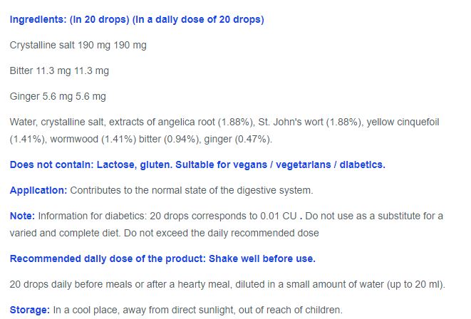 Съдържа органични концентрати от корен на ангелика (1,88 %), кентавър (1,88 %), корен на еньовче (1,41 %), билка от пелин (1,41 %), горчива детелина (0,94 %), както и корен на джинджифил (0,47 %).