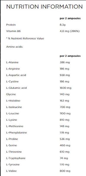Съставки: L-аланин, L-аргинин, L-аспарагинова киселина, L-цистеи, L-глутаминова киселина, Глицин, L-хистидин, L-изолевци, L-левцин, L-лизин, L-метионин, L-фенилалани, L-пролин, L-серин, L-треони, L-триптофан, L-тирозин, L-валин