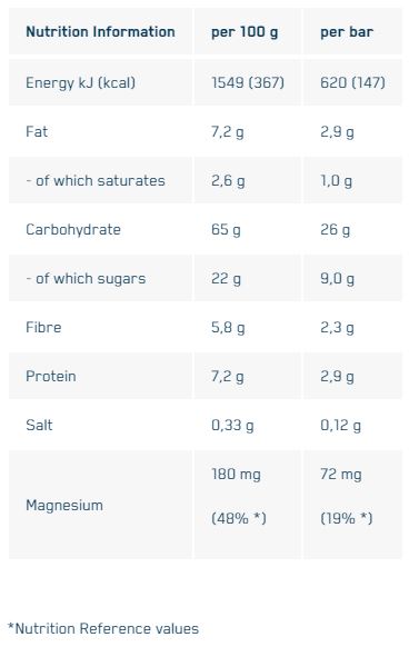 То съдържа въглехидрати, които ви осигуряват с енергия за дълго време, заради бавното си усвояване. Барчето е произведено само от напълно естествени съставки, включително пълнозърнести овесени ядки, парченца плодове и ядки; затова е подходящо и за вегани (съставките варират в зависимост от вкуса).