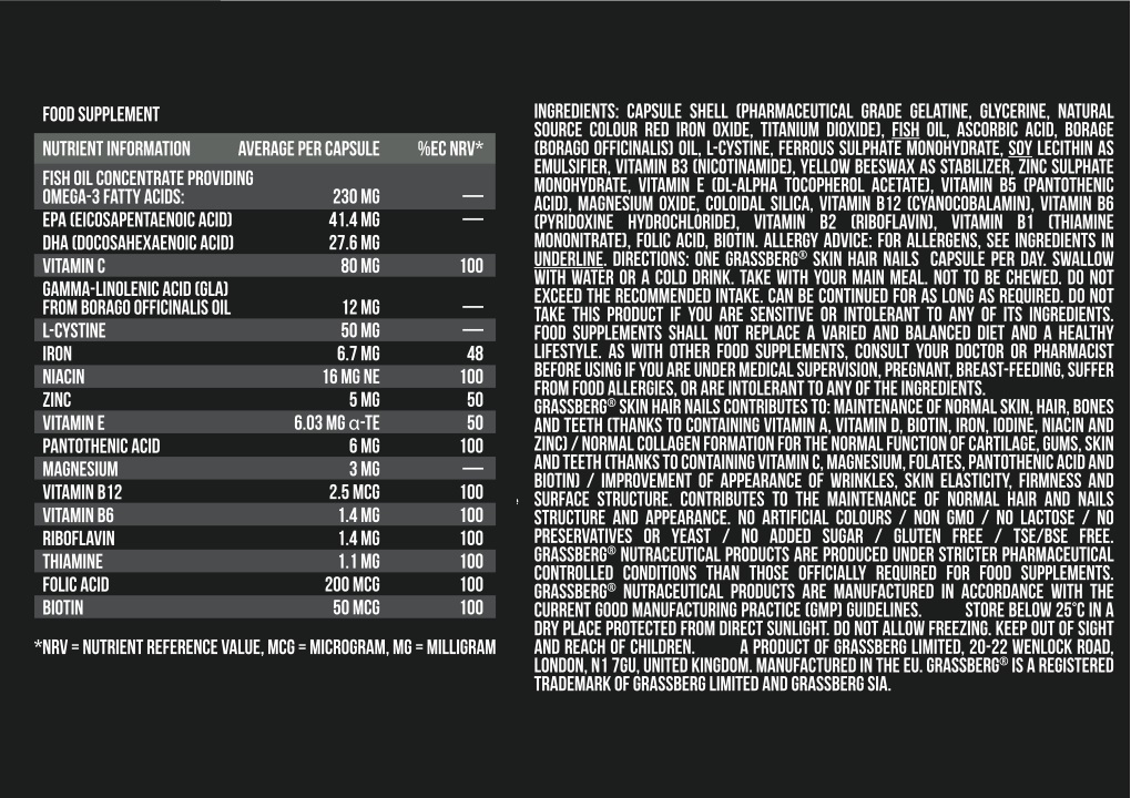Skin Hair Nails от Grassberg възстановява здравината и подобрява еластичността на безжизнената, тънка коса, както и допринася за здравето на ноктите. Добавката съдържа витамини, незаменими мастни киселини като концентрат от рибено масло и биотин, които възстановяват и защитават косата.