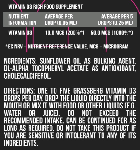 Vitamin D3 Drops от Grassberg ви предоставя висококачествен витамин D3 в течна форма. Той е най-важният витамин за здравословното функциониране на нашия организъм. Една доза от продукта съдържа 100 mcg витамин D3.