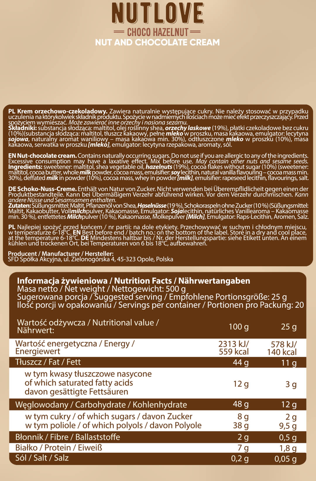 ALLNUTRITION NUTLOVE Choco Hazelnut не съдържа никакви химически добавки, изкуствени аромати, стабилизатори или консерванти. Не съдържа палмово масло. NUTLOVE Choco Hazelnut е напълно здравословен крем с вкус на ядки и разнообразна текстура. Разпределя се идеално върху омлети и сандвичи. Лесно се комбинира с други съставки при приготвянето на десерти или други ястия. Подходящ е като добавка към почти всяка закуска и може да се консумира с лъжица направо от кутията.