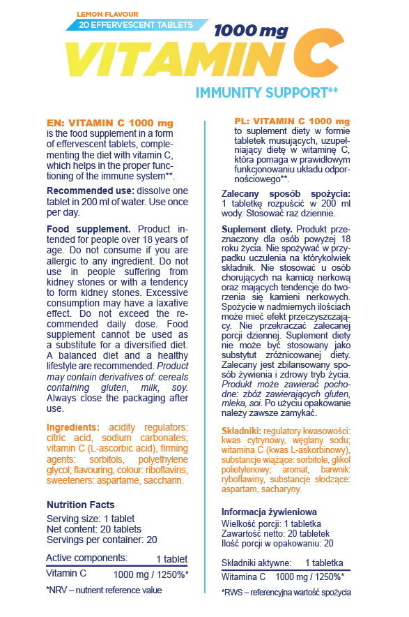 ALLNUTRITION под формата на ефервесцентни таблетки със страхотен вкус на лимон, подходящи за употреба по всяко време на деня. Витамин С е водоразтворимо хранително вещество, добре известно с жизненоважната си роля в имунната система. Витамин С е необходим и за производството на колаген (структурен белтък в съединителната тъкан) и следователно е важен за здравето на кожата, костите и ставите. Витамин С е необходим за метаболизма на аминокиселините, синтеза на хормоните и използването на много хранителни вещества, като фолиева киселина и желязо. Той е и високоефективен антиоксидант, който може да предпази клетките и молекулите на организма от увреждане от свободните радикали и реактивните кислородни молекули, образувани при нормалния метаболизъм и излагането на стресови фактори на околната среда. Този продукт включва биофлавоноиди, които действат синергично, за да подпомогнат използването на витамин С.