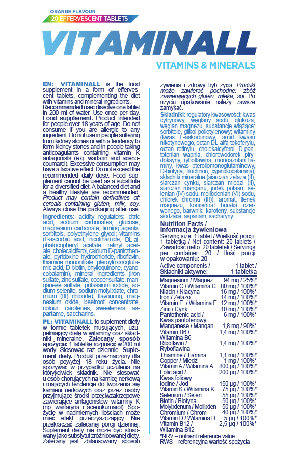 ALLNUTRITION VITAMINALL допринася за поддържане на добро здраве благодарение на съдържанието на коприва (копривата подпомага правилното функциониране на имунната система) и поддържа доброто настроение благодарение на наличието на горчив портокал. Продуктът е предназначен за хора, чийто ежедневен хранителен режим изисква попълване на запасите от витамини и минерали, включително физически активни лица* и спортисти* (*съдържащият се в продукта женшен спомага за поддържане на издръжливост на необходимото ниво). Внимателно разработената формула съдържа подбрани витамини и минерали в специално подбрани съотношения, както и екстракти от коприва, горчив портокал, зелен чай, женшен, коензим Q10 и алфа-липоева киселина (ALA).