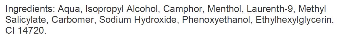 Съставки: вода, изопропилов алкохол, камфор, ментол, лаурет-9, метил салицилат, карбомер, натриев хидроксид, феноксиетанол, етилхексилглицерин