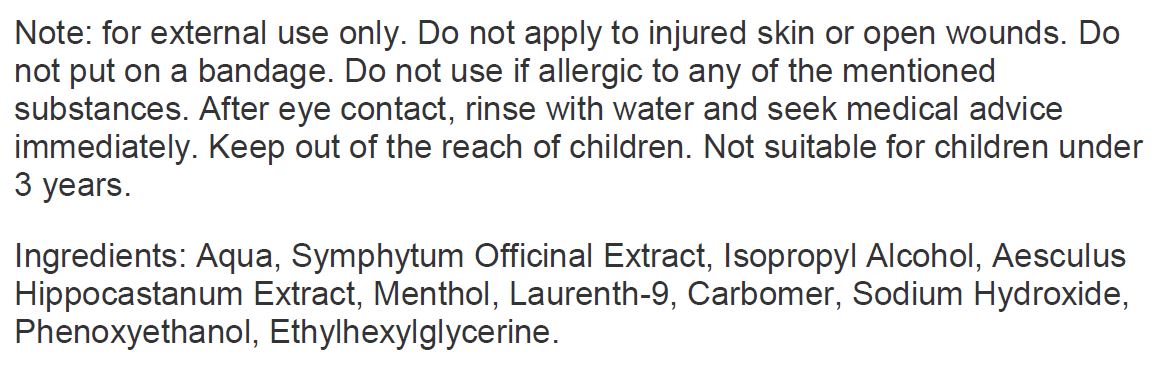 Съставки: вода, екстракт от Symphytum Officinale, изопропилов алкохол, екстракт от Aesculus Hippocastanum, ментол, лаурент-9, карбомер, натриев хидроксид, феноксиетанол, етилексилглицерин