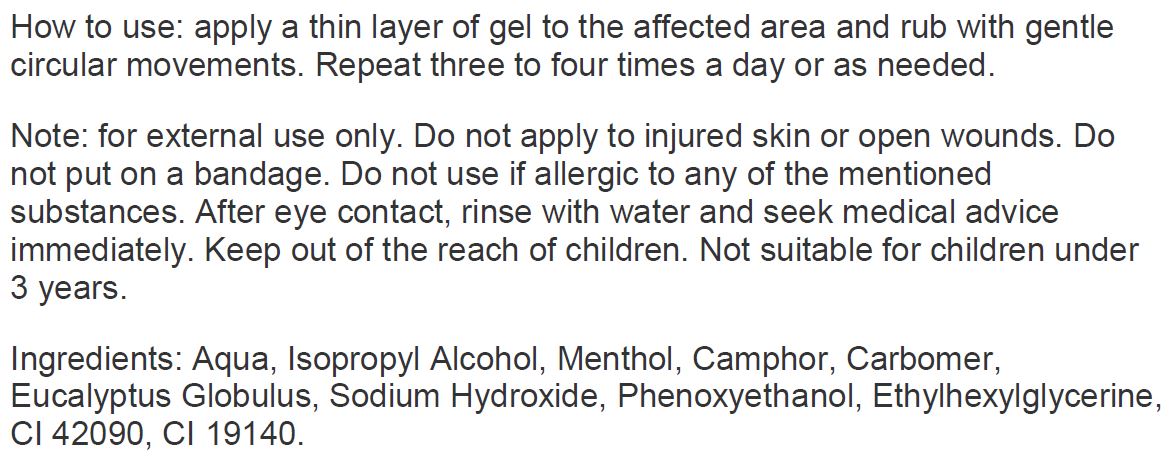Начин на употреба: Нанесете тънък слой от гела върху засегнатата област и втрийте с леки кръгови движения. Повтаряйте три до четири пъти дневно или при необходимост.