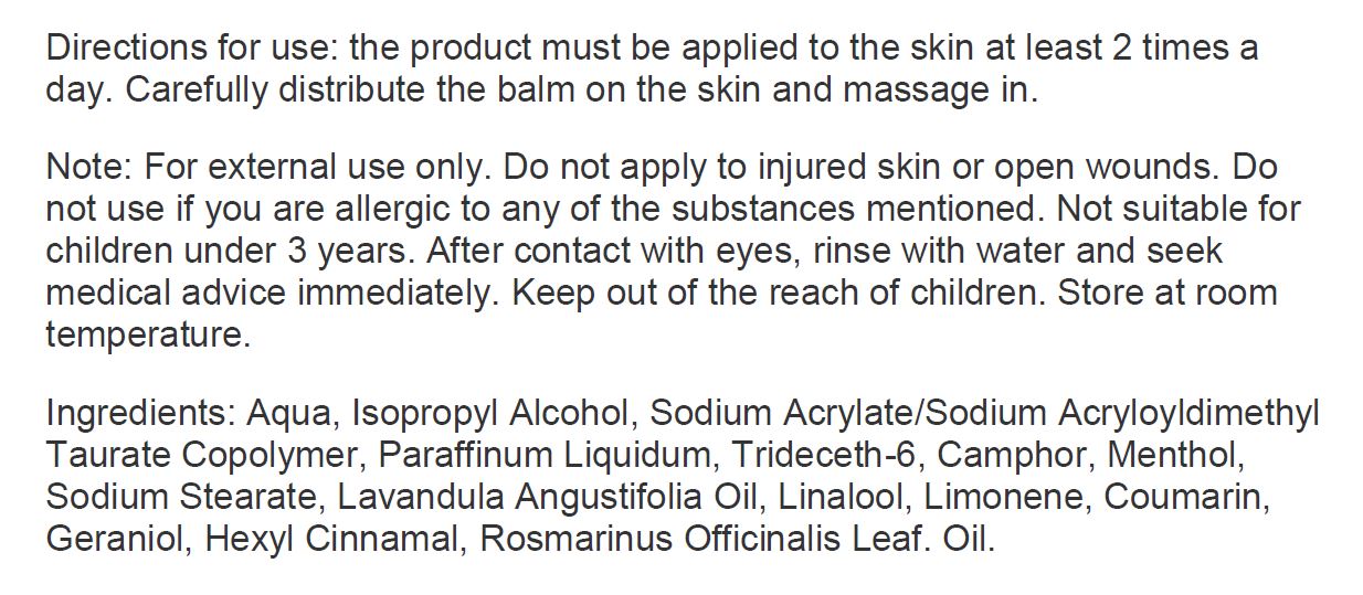 Начин на употреба: Нанесете тънък слой от гела върху засегнатото място и го втривайте с леки, кръгови движения. Повтаряйте процеса няколко пъти дневно, при необходимост.