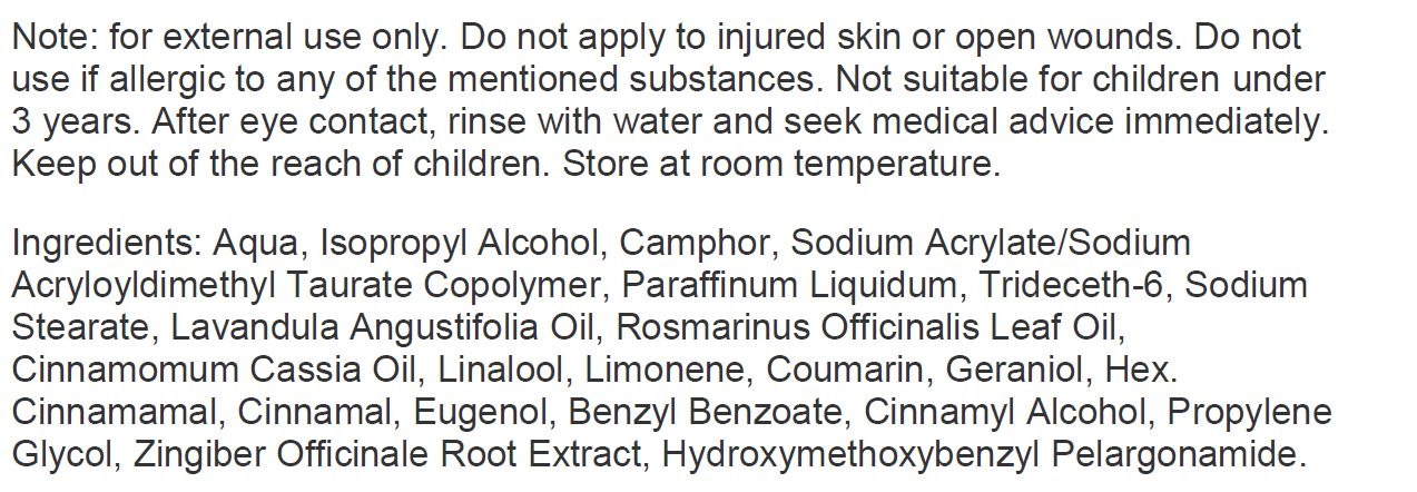 Съставки: вода, изопропилов алкохол, камфор, натриев акрилат/натриев акрилоилдиметил таурат съполимер, течен парафин, тридецет-6, натриев стеарат, масло от Lavandula Angustifolia, масло от листа на Rosmarinus Officinalis, масло от канела от касия, линалоол, лимонен, кумарин, гераниол, канела, евгенол, бензилбензоат, цинамилов алкохол, пропилей гликол, екстракт от корен на Zingiber Officinale, хидроксиметоксибензил пеларгонамид
