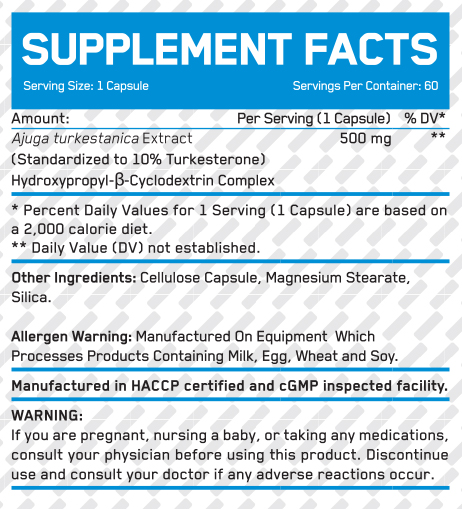 Съставки: туркестерон (екстракт от ajuga turkestanica), стандартизиран до 10% туркестерон, микрокристална целулоза, магнезиев стеарат