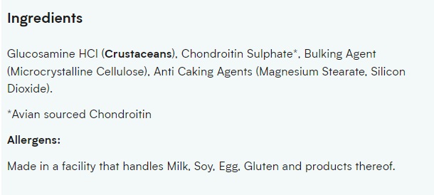 Съставки: Глюкозамин HCl (ракообразни), хондроитин сулфат, набухвател (микрокристална целулоза), антислепващи агенти (магнезиев стеарат, силициев диоксид)