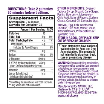 Съставки: 5-HTP (5-хидрокситриптофан) - 25 мг. в доза, L-теанин - 100 мг. в доза, екстракт от маточина - 1 мг. в доза, Мелатонин – 1 мг. в доза