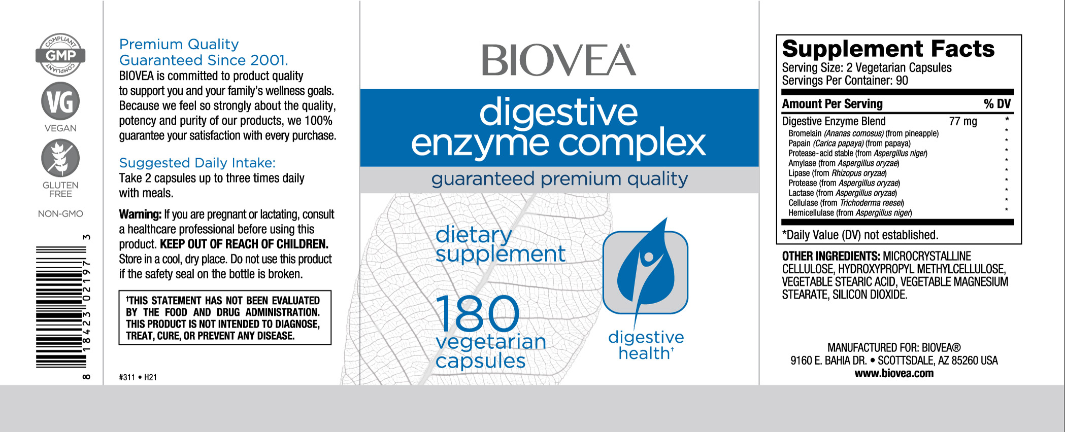 Digestive Enzyme Complex от BIOVEA е смес от храносмилателни ензими с вегетариански произход. Продуктите, класифицирани като храносмилателни ензими, улесняват храносмилането и усвояването на хранителните вещества, спомагат за поддържането на правилното рН в стомашно-чревния тракт и действат като бариера срещу нахлуването на вируси и бактерии. Съществуват седем основни вида храносмилателни ензими, всеки от които има различни подкласификации и различни функции. Основните ензими и техните специфични функции са следните: амилазата разгражда нишестето, целулозата разгражда фибрите, лактазата разгражда млечните продукти, липазите разграждат мазнините, маслата и триглицеридите, малтазата разгражда нишестето и зърнените култури, протеазите разграждат протеините, а захарозата разгражда захарите.