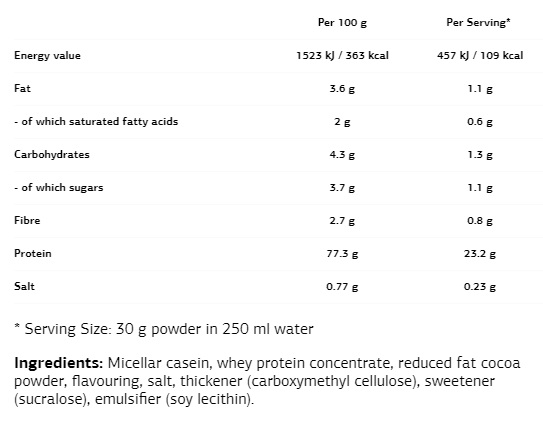 VPLAB Casein & Whey осигурява динамична смес от суроватъчен протеин и мицеларен казеин, която действа по време на тренировка и през нощната фаза на възстановяване. Суроватъчният протеин има най-висока биологична стойност от всички протеини, което се отнася за протеин, който има всички необходими незаменими аминокиселини за биосинтеза на протеини и е бързодействащ, за да подпомогне възстановяването на аминокиселините, необходими по време и след натоварващи дейности. Освен това тази революционна протеинова формула включва мицеларен казеин с удължено действие, който действа и след края на напрегнатите дейности, за да възстановява непрекъснато разрушените мускули.