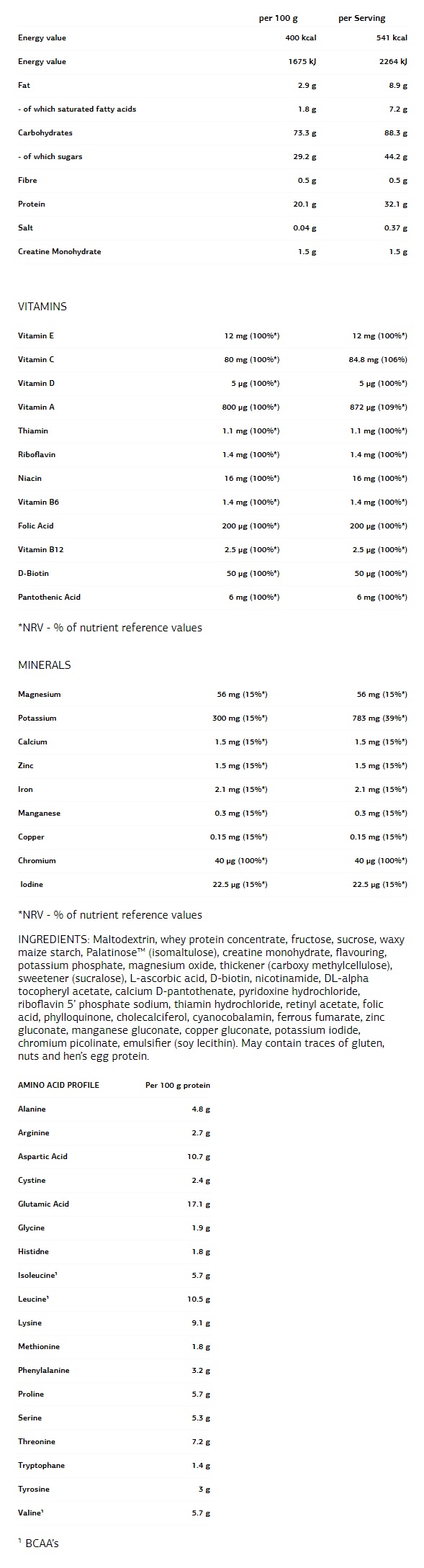 Многостепенният въглехидратен комплекс на Mass Builder с дълговерижни въглехидрати и пребиотици ще се погрижи да имате необходимите запаси от енергия, които да използвате, докато се потите по време на тренировката. Висококачественият Creapure® Creatine и 10 различни витамина ви помагат да се натоварите повече, отколкото сте предполагали, че е възможно, като увеличават максимално ефективността на тренировката ви.